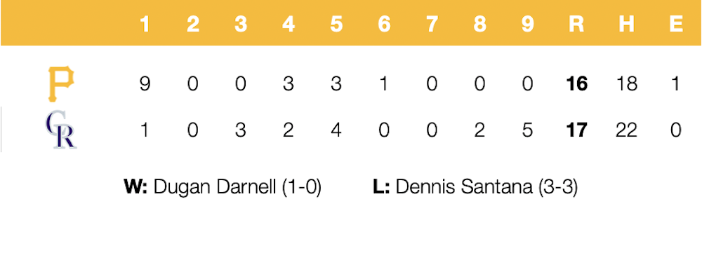 The Pirates scored nine runs in the first inning but blew two separate nine-run leads in a 17-16 meltdown to the Rockies that snapped a five-game winning streak tonight at Coors Field.Â