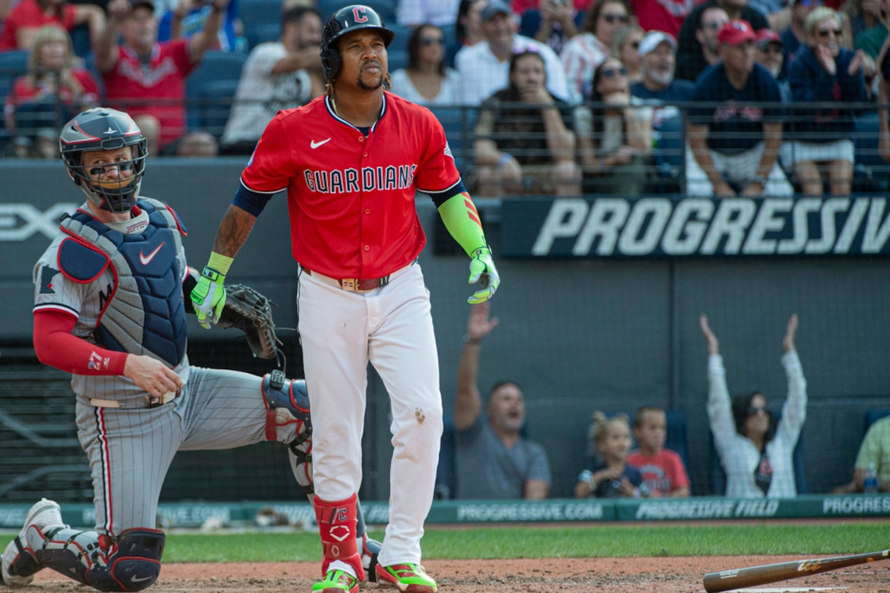 The seven-time All-Star continued his giveaway day heroics Saturday, blasting a game-tying home run and scoring the winning run as the Guardians picked up a 5-4 victory against the Twins in front of a capacity crowd.