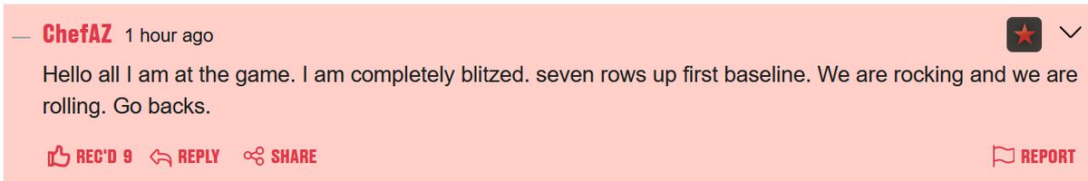 It was another surprisingly lively and well-populated Gameday Thread tonight, with 291 comments at time of writing. A number went Sedona Red, but I’m giving this one to ChefAZ, by popular acclaim but also because the ensuing comment threads from the rest of the ‘Pit were pretty adorable and hilarious, on this one and on his later contributions: