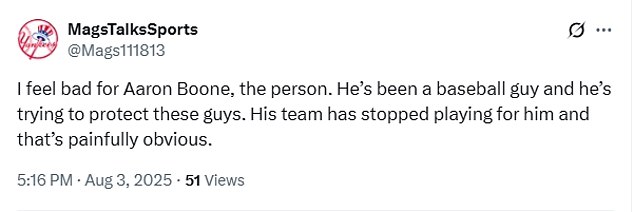 ‘I feel bad for Aaron Boone, the person. He’s been a baseball guy and he’s trying to protect these guys. His team has stopped playing for him and that’s painfully obvious,’ a second stated.