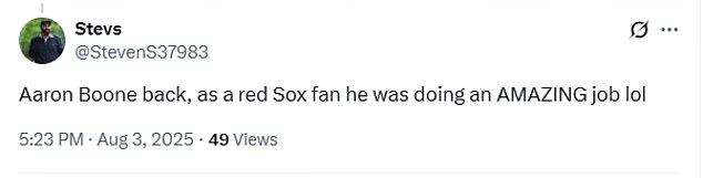 ‘Aaron Boone back, as a red Sox fan he was doing an AMAZING job lol,’ a fourth continued.Â