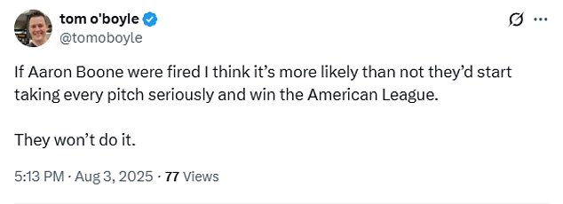 ‘If Aaron Boone were fired I think it’s more likely than not they’d start taking every pitch seriously and win the American League. They won’t do it,’ one MLB fan said.Â