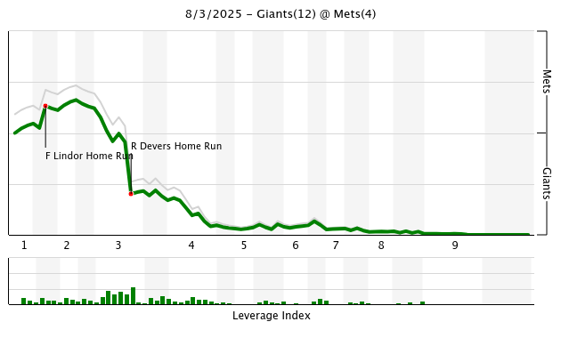 Francisco Lindor hit his 21st home run of the year in the first inning to give the team an early 1-0 lead. However his error in the third on a stolen base opened the floodgates. Jung Hoo Lee took third on the error and scored the tying run on a single by Patrick Bailey. Then after a strikeout and walk, Rafael Devers blasted a three-run home run to give the Giants a 4-1 lead.