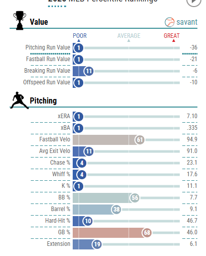 Right now, his pitching is just not competitive. Opposing lineups are scorching his fastball (.372 batting average against), which is rough when that’s far and away his most-utilized weapon. In fairness, his offspeed stuff hasn’t fared much better: His slider, changeup, and sinker are being hit just as hard. The curveball is his only weapon that’s seen an opposing average below .300.