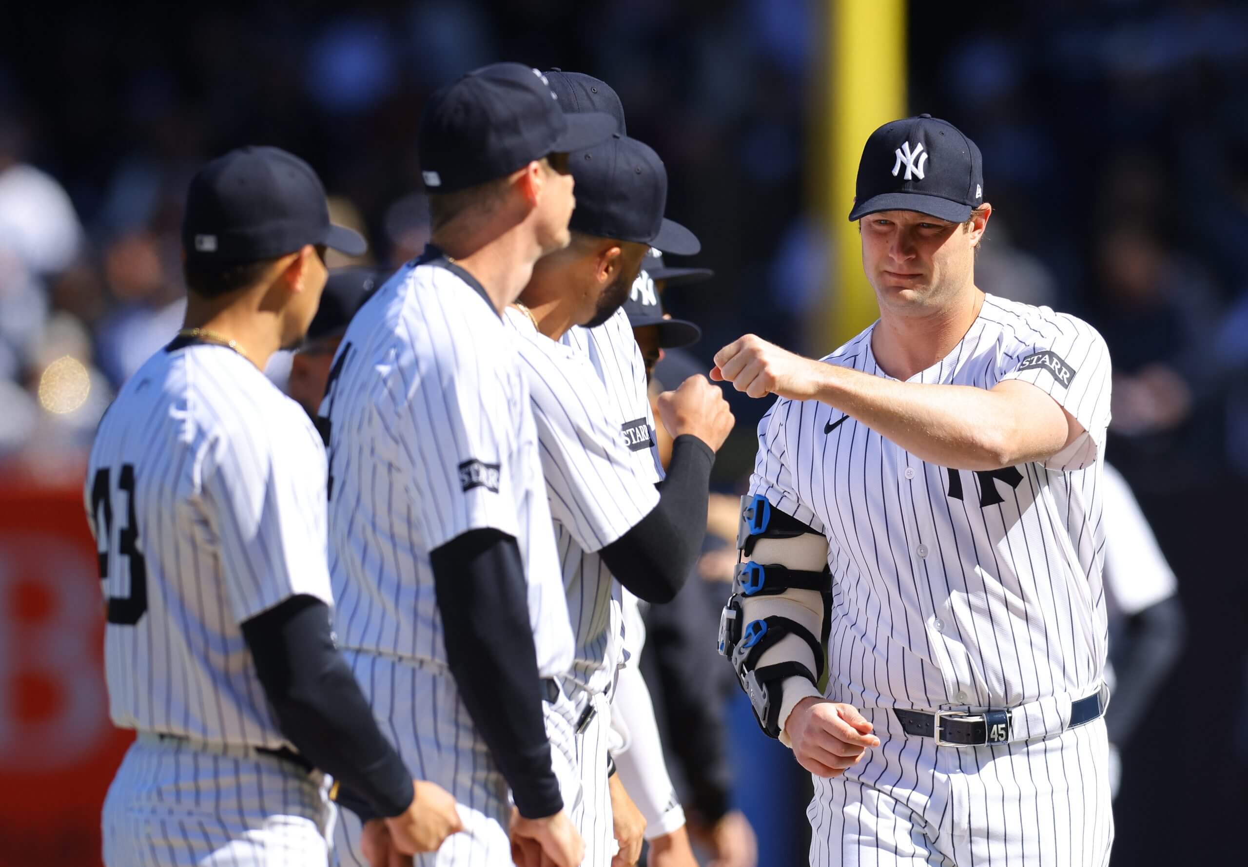 The Yankees’ Gerrit Cole (right) underwent Tommy John surgery in March and will be out for the entire 2025 season. (Mike Stobe / Getty Images)