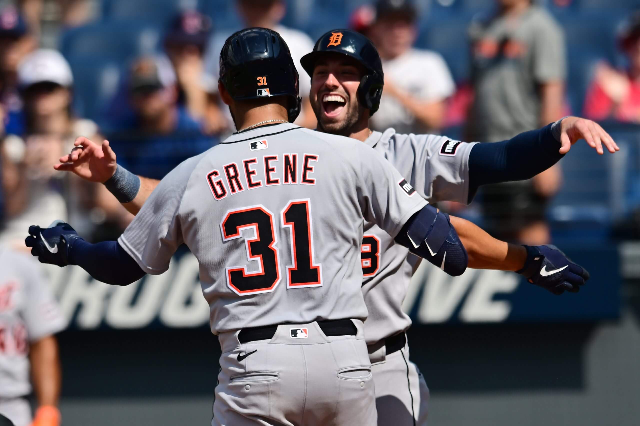 The Tigers’ Matt Vierling and Riley Greene were all smiles during an epic win on July 6. (Ken Blaze / Imagn Images)