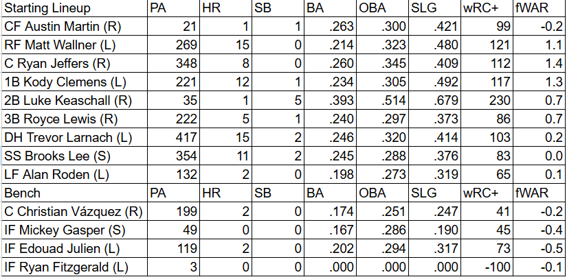 Only six position players from the Opening Day roster are currently on the active roster – catchers Ryan Jeffers and Christian Vázquez, infielders Eduoard Julien and Mickey Gasper, and outfielders Matt Wallner and Trevor Larnach. Byron Buxton would not waive his no-trade clause, otherwise he might have been dealt last week as well. He has been out with a ribcage injury, although he could return this weekend.
