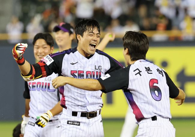 Cheon Seong-ho of the LG Twins (C) is congratulated by teammate Gu Bon-hyeok after hitting a walk-off single in the bottom of the 10th inning of a Korea Baseball Organization regular-season game against the Hanwha Eagles at Jamsil Baseball Stadium in Seoul on Aug. 8, 2025. (Image courtesy of Yonhap)