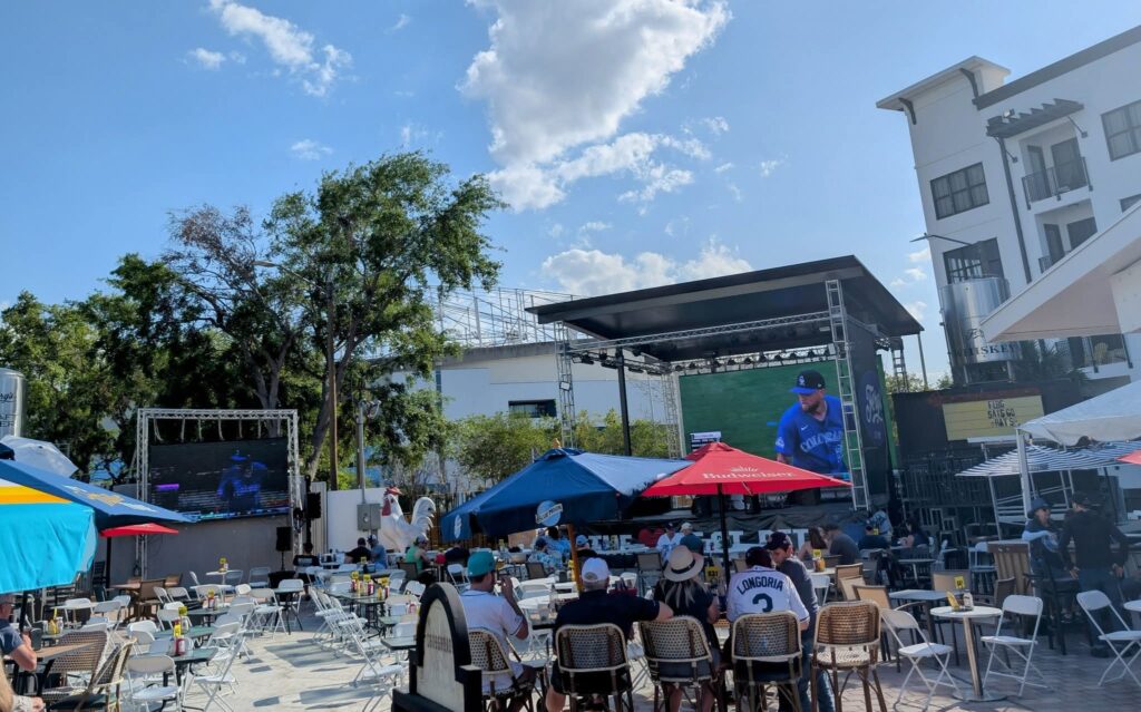 A storm-damaged Tropicana Field looms over Ferg’s Bar and Grill’s outdoor venue. Photo by Mark Parker.