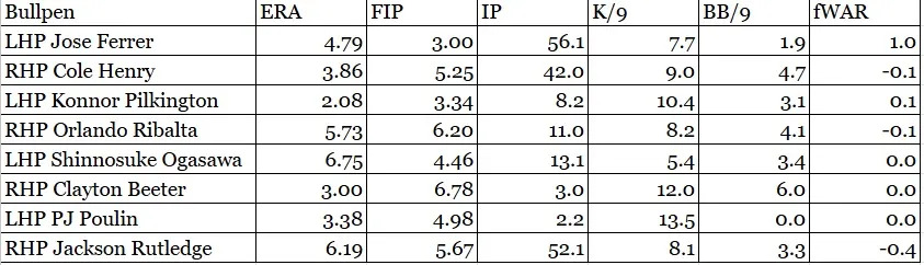 The Nationals have by far the worst bullpen ERA in baseball at 5.84 with the second-worst strikeout rate. They traded away closer Kyle Finnegan in July, leaving Jose A. Ferrer to handle closing duties. Ferrer throws strikes, with the fifth-lowest walk rate, and his 59 percent groundball rate is tenth among relievers. Cole Hnry has the fourth-highest soft-hit rate and the fifth-highest pop-up rate among relievers. Jackson Rutledge has the third-highest home run rate among relievers.