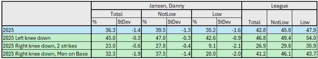 The major dropoff in Jansen’s framing is almost entirely coming in those situations where he’s dropped his right knee. With the left knee down he’s less than half a standard deviation below average, but worse on low strikes. These are numbers we hoped Jansen could improve on, but they’re in line with his previous career.