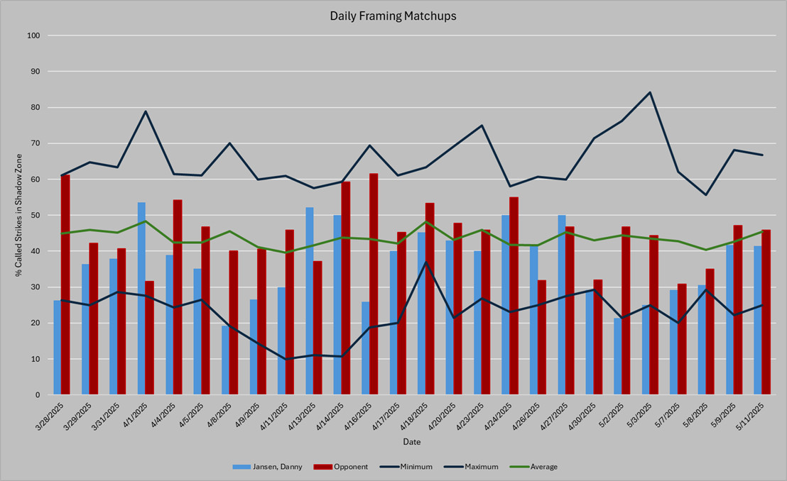 Jansen has “lost” to his opposing catcher (meaning the Rays got a lower percentage of pitches in the shadow of the zone called as strikes) in 22 out of 26 games. And he’s recorded the lowest number of strikes of any catcher in the league (minimum 10 pitches in the shadow zone) on four of those days.