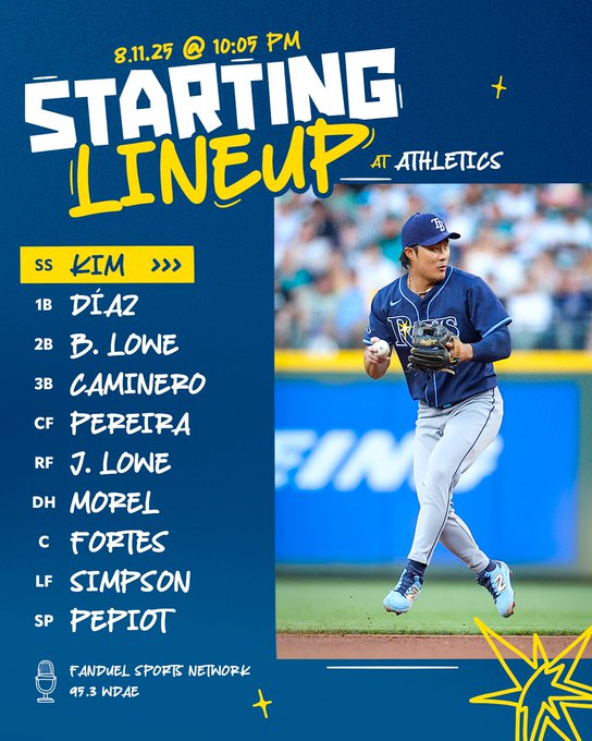 Taking the mound in today’s 7:05 start is Jeffrey Springs, who was traded to the A’s with fellow southpaw Jacob Lopez from Tampa Bay last December.  Springs is 10-7 with a 3.89 ERA in 24 appearances (22 starts) in 2025. He started against them in Tampa on July 1 and went 5.1 innings giving up four hits and two earned runs. He got no decision in that game.  Springs will face off against Ryan Pepiot for the Rays. He is 7-9 with a 3.77 ERA in 24 starts.