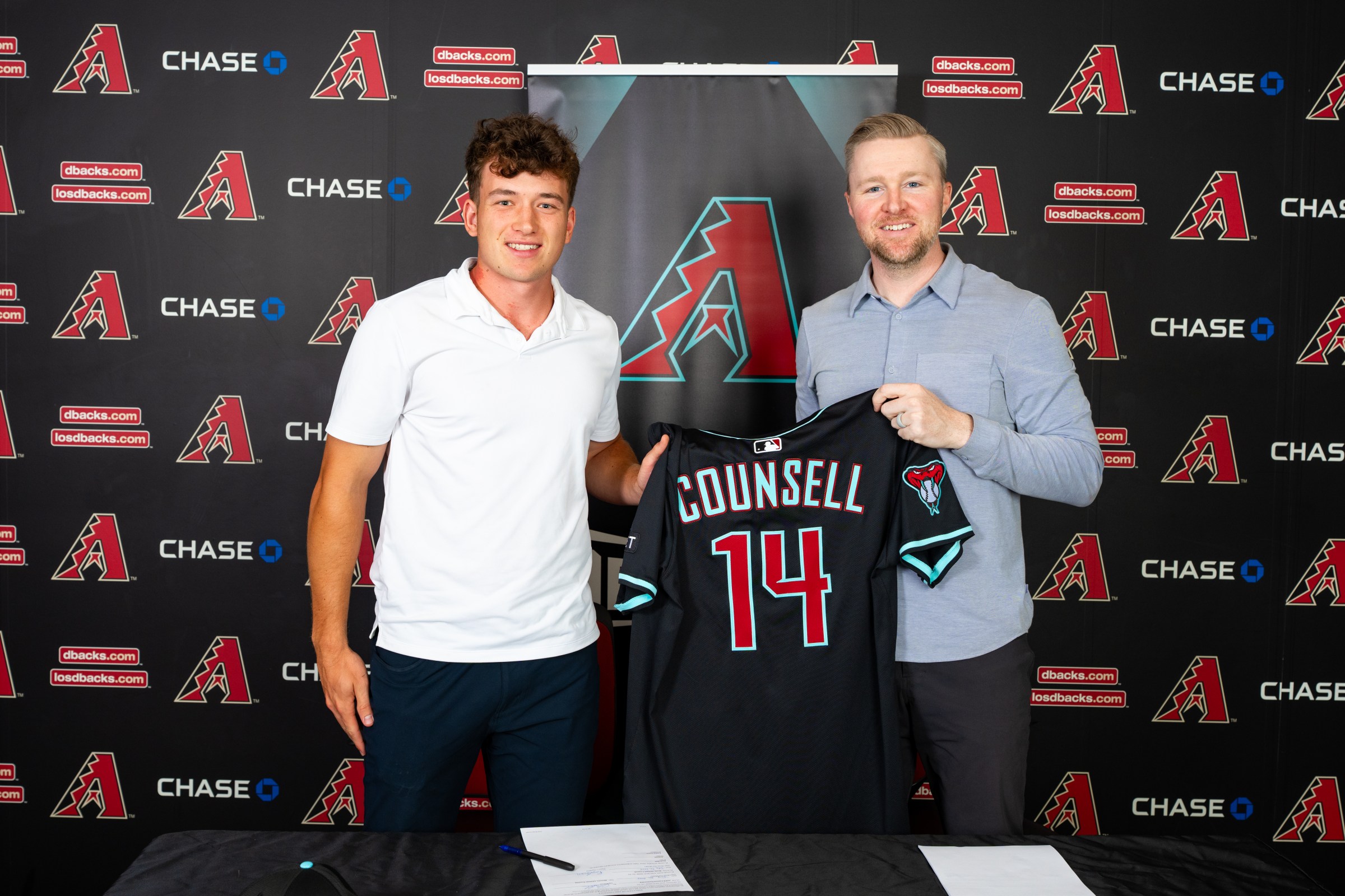 SCOTTSDALE, ARIZONA – JULY 20: Arizona Diamondbacks tenth-round pick Brady Counsell poses with Diamondbacks amateur scouting director Ian Rebhan after signing his contract at Salt River Fields at Talking Stick on July 20, 2025 in Scottsdale, Arizona. (Photo by Kelsey Grant/Arizona Diamondbacks/Getty Images) Getty Images