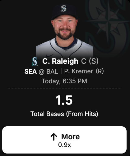 Fortunately for the Mariners, tonight’s matchup looks promising. Orioles starter Dean Kremer isn’t the most intimidating pitcher (4.35 ERA, 1.28 WHIP). In addition, he’s allowed four or more runs in 11 of his 23 outings this season. Away from home, Seattle is averaging baseball’s third-most runs per game (5.12). That level of offensive production should give Raleigh several chances to earn an extra-base hit or two.