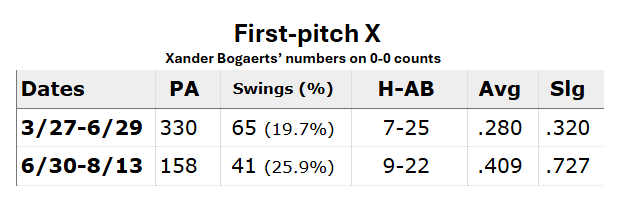And shortly after that, he changed something else. He started swinging more often at the first pitch of at-bats.
