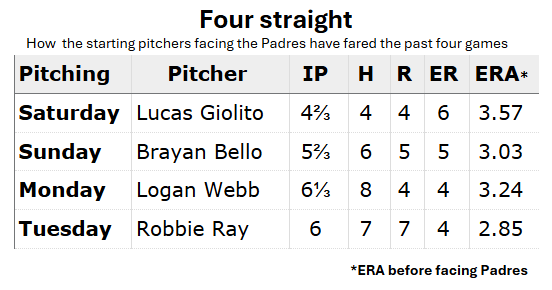 When the Padres faced Logan Webb and Robbie Ray the first week of June, Webb shut them out over eight innings and Ray held them to two runs in seven innings.