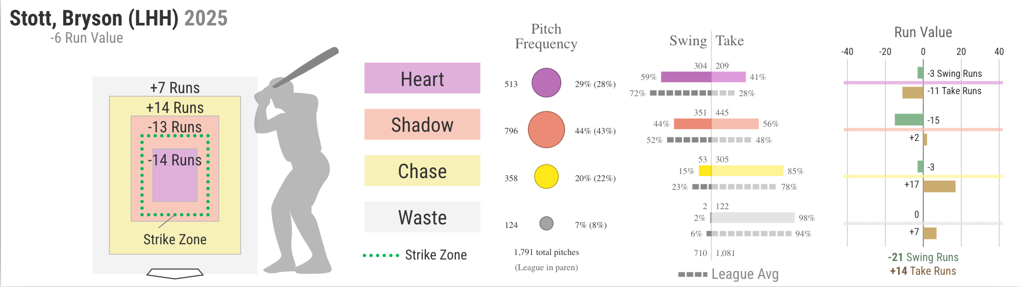 Baseball Savant breaks this down further by runs added or subtracted by swing and take decisions within the heart region. And so we can see that Stott’s -14 run value there is the result both of swinging and taking: Stott isn’t terribly good at doing damage with the heart region pitches he swings at, and he lets too many hittable pitches there go by. But the latter issue is the worse of the two: he loses eleven runs with his takes, and just three with his swings. This isn’t surprising: Stott is an extremely patient hitter, swinging at just 39.6% of pitches this season, and 54.9% of pitches in the strike zone. Only eight qualified batters swing less often overall. And only one— the Angels’ Taylor Ward— is less likely to swing at pitches in the strike zone. So it tracks that he loses a lot of run value by not swinging at pitches in the heart region.