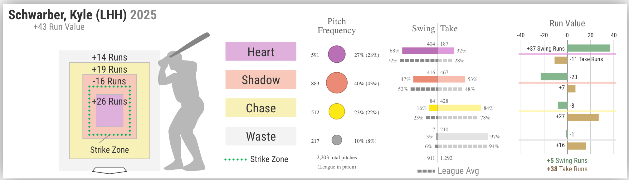 Schwarber’s overall run value in the heart region is +26, but when we break that down by swing runs and take runs, we see that only his swings are adding positive value there. His take decisions have cost him eleven runs—the exact number that Stott’s takes have cost him. Schwarber is most famous for his prodigious (I might even say ludicrous) power, but he’s also notable for an exceedingly selective approach at the plate. He’s swinging at 41.4% of pitches overall this season, not much more than Stott (though there’s a somewhat bigger gap in zone swing percentage, where Schwarber posts a 63.2% to Stott’s 54.9%). So Schwarber loses as much run value in the heart region with takes as Stott does. Nevertheless, he’s at the top of the overall heart region run value leaderboard among the Phils, while Stott is at the bottom. Why? Well, his (and here, the only word that will do is ludicrous) +37 swing runs. There are not many comparisons in which Shohei Ohtani looks like a slouch, but this is one of them: Schwarber leads him by five runs added in the heart region.