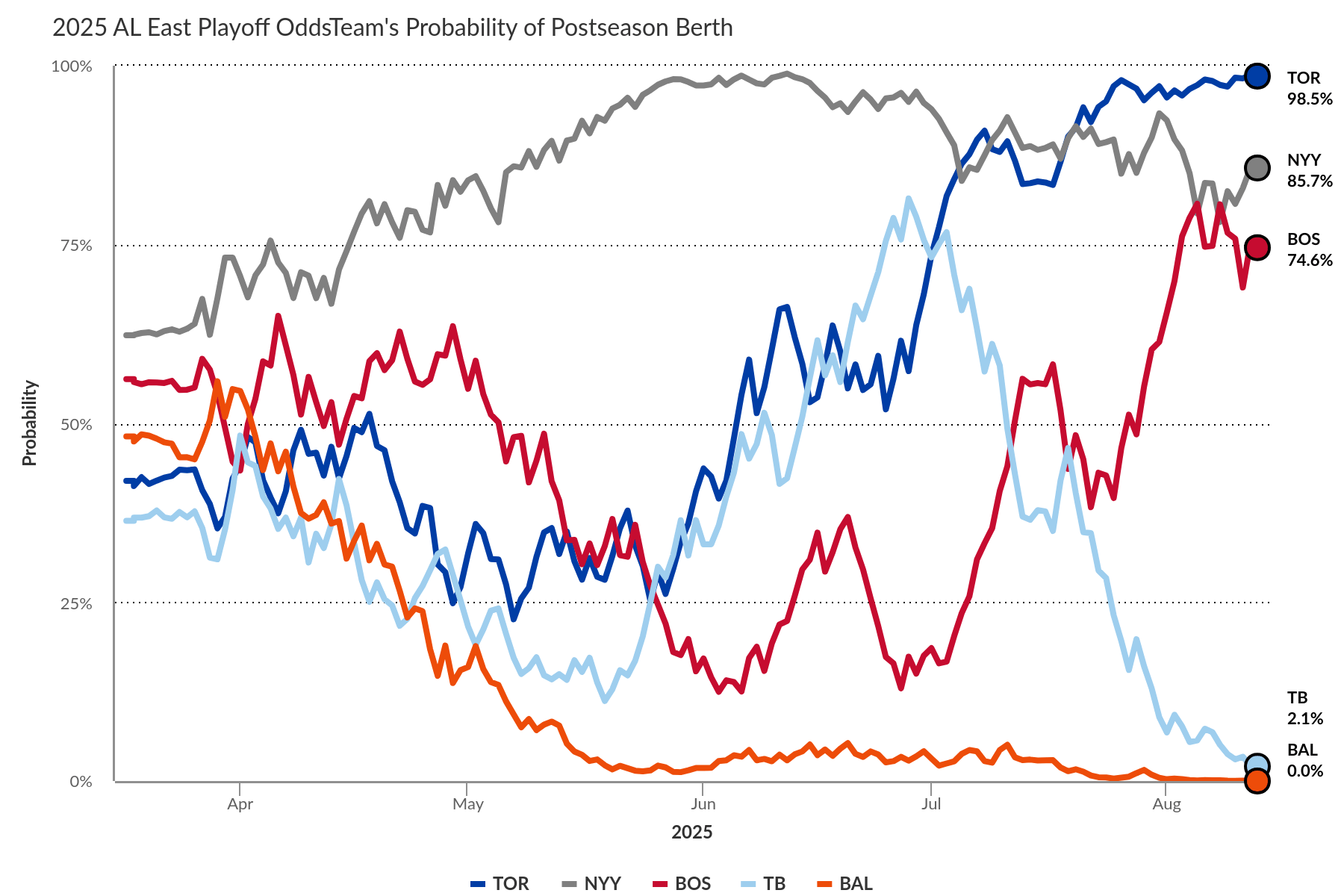 At the 2025 trade deadline the team moved the deck chairs around, swapping two catchers and two starting pitchers out via deals, but without upgrading the abysmal outfield that has suffered poor performance across all three positions. A few more injuries later (B. Lowe had 35 plate appearances in July, Aranda fractured his wrist on August 1) and the team’s playoff odds have dropped from 81.4% at the end of June to just 2.1% as of today, August 13.