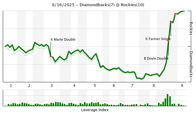 Return of the Competent: Adrian Del Castillo (4 AB, 2 H, 1 R, 2 RBI, 1 2B, 1 HR, 1 K, +12.4% WPA), Ryne Nelson (61/3 IP, 8 H, 4 ER, 0 BB, 4 K, +12.8% WPA)