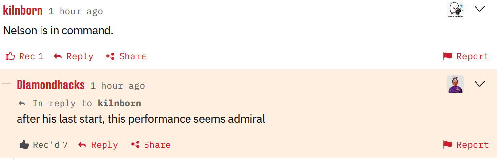 It was a livelier Gameday Thread than last night, with a lot of good fun to be had, as well as a disturbingly strong pun game being exhibited by many participants, which is always a positive in my book. We have 225 comments at time of writing, with Comment of the Game going by popular acclaim as well as duly earned honors for the most terrible pun of the evening to Diamondhacks for their response to kilnborn’s remark about Nelson’s performance: