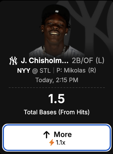 Chisholm is 3-4 in his career against Mikolas with a double and a pair of singles. So far this season, he is posting a .859 OPS and .523 slugging against right-handed pitching compared to .657 and .33 against lefties. While he was held hitless yesterday, the Yankees standout has tallied more than 1.5 total bases in three of his past five games. Chisholm is trending in the right direction at the plate and has a friendly match-up with Mikolas on the mound.