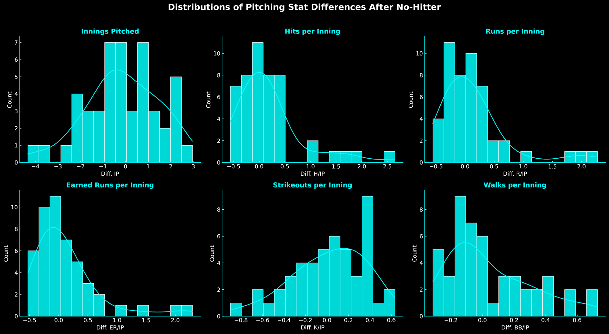 Here we can see the histograms for each of the 6 statistics. IP and K/IP are roughly symmetric around 0—an early indicator there might not be a systematic drop in workload or whiffs after a no-hitter. In contrast, H/IP, R/IP, ER/IP, and BB/IP show a noticeable right skew (a tail that stretches to the right), suggesting more contact and more traffic on the bases in the outing after the no-hitter. But are these differences significant?