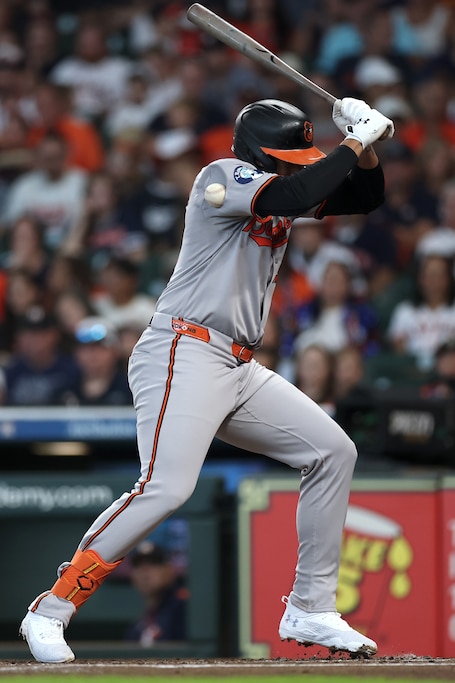 Orioles designated hitter Samuel Basallo is hit by a pitch in his first major league plate appearance Sunday in Houston. (Tim Warner/Getty Images)