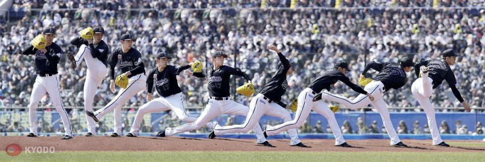 Composite photo shows Roki Sasaki of the Lotte Marines pitching against the Orix Buffaloes in a Pacific League baseball game at Zozo Marine Stadium in Chiba, Japan, on April 10, 2022. Sasaki threw a perfect game. (Kyodo) ==Kyodo