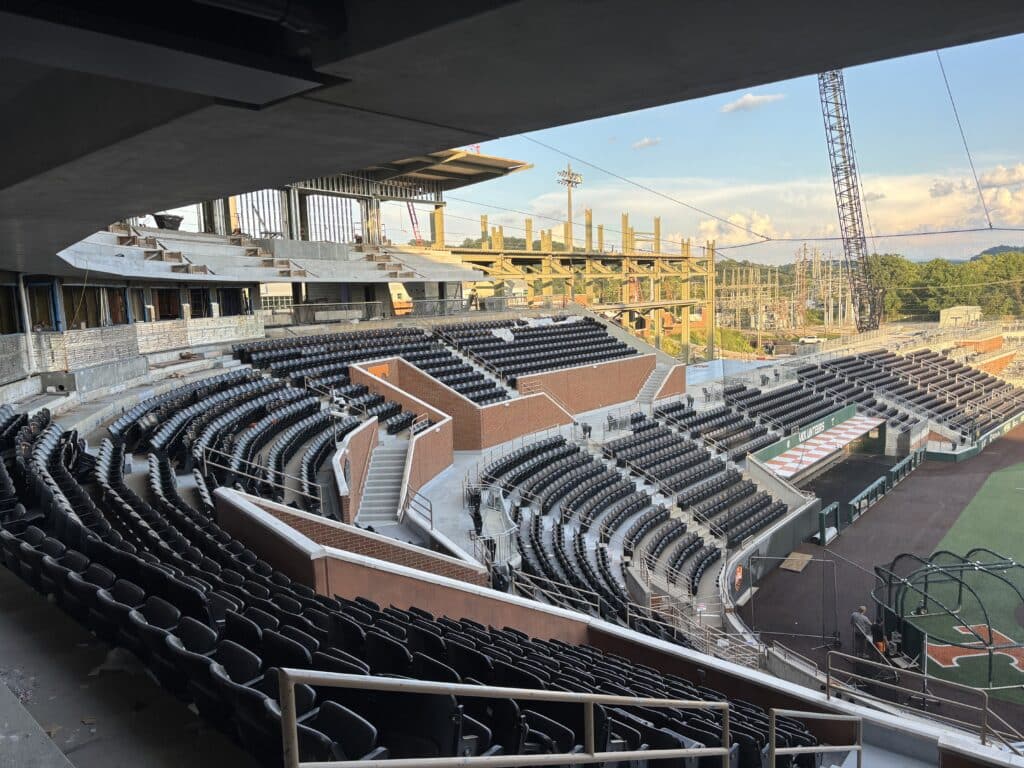 View of the left field press and club level construction from seats down the third base line. (08/18/25). Photo by Ryan Schumpert/RTI