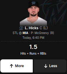 Miami’s backstop is left-handed. Therefore, it’s no surprise that he’s hitting .275 against right-handed pitchers. On the other side, it’ll be Michael McGreevy on the bump for St. Louis. The Cardinals’ hurler has notched a solid 4.41 ERA over nine appearances this season. However, southpaws are batting .295 against him thus far. Away from home, the Marlins have scored the sixth-most runs per game in baseball (4.75). There should be several runners on base for Hicks to drive in tonight.