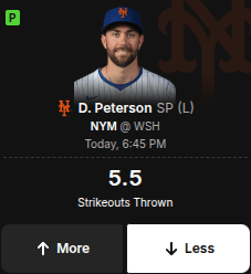 Peterson, for all his positive attributes, isn’t exactly a fireballer. The southpaw has a middling 7.7 K/9 ratio. In just two of his last ten starts, the left-hander has produced more than five K’s. Tonight’s opponent, the Nationals, have accounted for the fourth-fewest total strikeouts in baseball. That doesn’t bode well for Peterson’s chances on Tuesday.