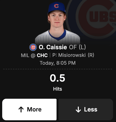 While Caissie has a solid track record, it’s easier to do damage against minor-league arms. Tonight’s matchup against the Brewers presents a unique challenge. Rookie hurler Jacob Misiorowski has been a force this year, notching a 3.89 ERA and 13.0 K/9 over eight starts. However, the fireballer has coughed up seven earned runs over his last 5.1 innings. In addition, he’s worse against left-handed batters (.711 OPS) compared to righties (.442 OPS). Even against a budding ace, one hit feels like a reasonable total for Caissie.