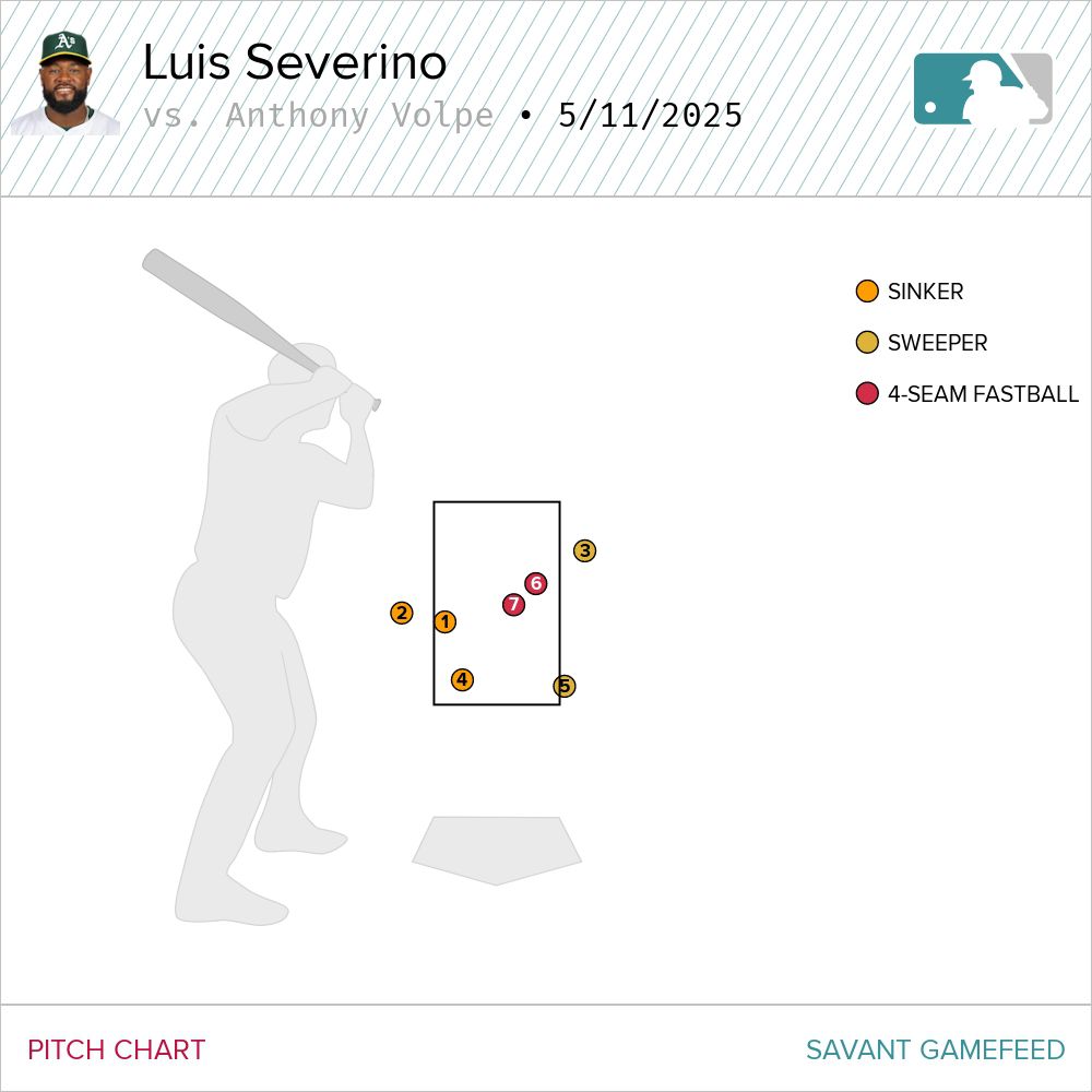 Instead, Volpe takes it for a called strike, the pitch landing right on the inside black as Severino nails his target. It’s a good thing Volpe doesn’t offer at this pitch as there was scant chance at doing damage given Severino’s execution.