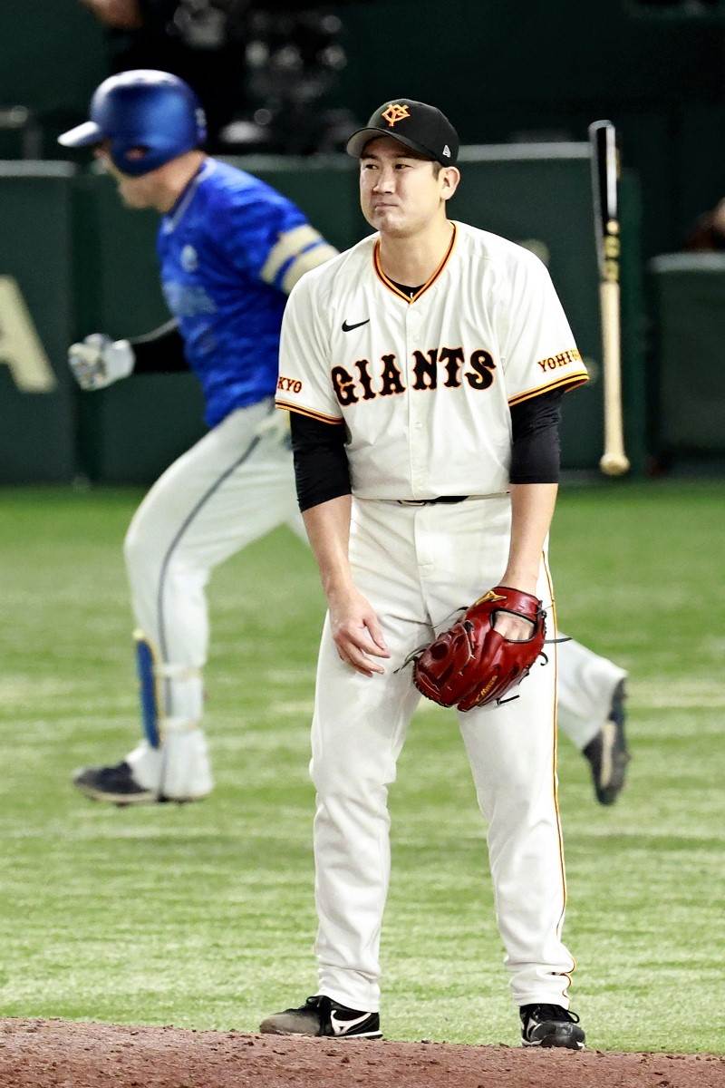 With two outs and a runner on third in the top of the 9th inning, the Giants’ Tomoyuki Sugano allows the go-ahead run to the Baystars’ Shugo Maki on Monday at Tokyo Dome.