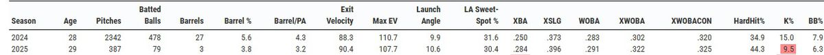 We were already aware that he was having trouble getting around on the fastball. Keep in mind here that the league is posting a .261/.346/.422 line with a .358 xwOBA. Those numbers took a drop in 2024 and continued that drop this year. When Alex arrived, he was initially getting good numbers on the fastball. 100ish plate appearances proved it to be a mirage. It gets worse.
