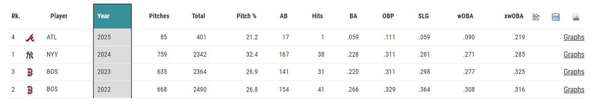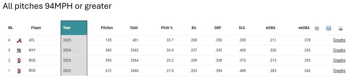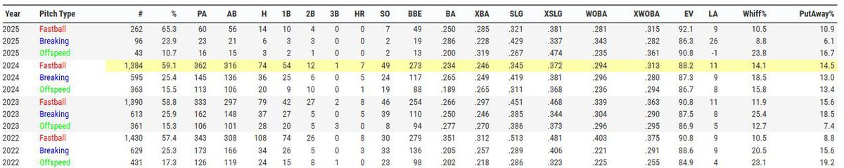 We were already aware that he was having trouble getting around on the fastball. Keep in mind here that the league is posting a .261/.346/.422 line with a .358 xwOBA. Those numbers took a drop in 2024 and continued that drop this year. When Alex arrived, he was initially getting good numbers on the fastball. 100ish plate appearances proved it to be a mirage. It gets worse.