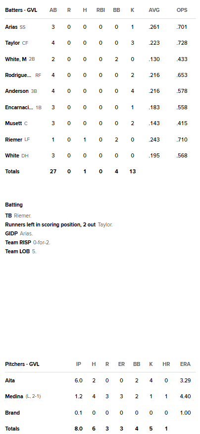 Much like the Portland game, this one was scoreless entering the seventh inning, thanks to a elite performance from starter Blake Aita, who allowed just two hits in six innings. Reliever Manuel Medina allowed all three runs in relief and was saddled with the loss.