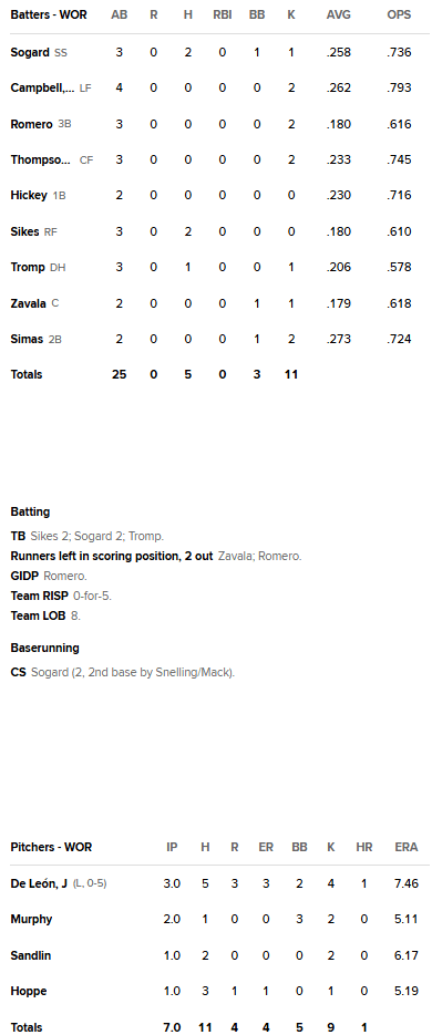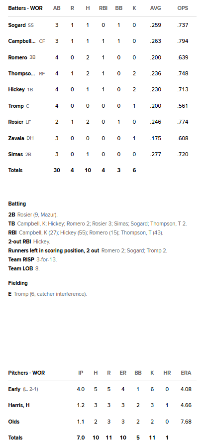 The Woo Sox did have ten hits on the day, with Mikey Romero, Trayce Thompson, and Corey Rosier each managing two hits.