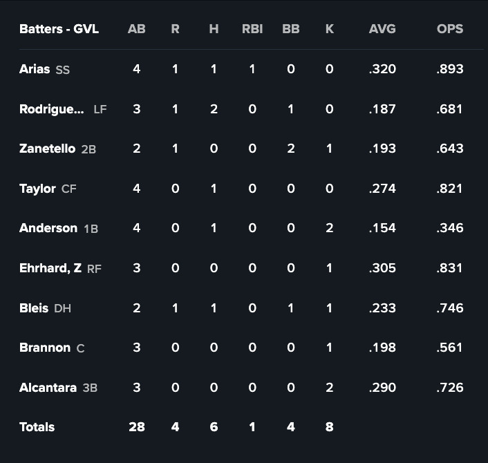 Greenville staved off a late rally by Hub City (Rangers Triple-A), a team that bit itself earlier in the game with three defensive errors and maanged just two hits. Yophery Rodriguez, for the record, matched that total himself. The fate of this game may have been a non-issue late, though, if any of Greenville’s six hits were an extra-base hit, but luckily Franklin Arias cranked a 2-run RBI in way back the bottom of the 3rd to end the scoring on the night for Greenville and make the score 4-0.
