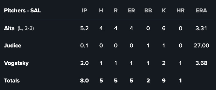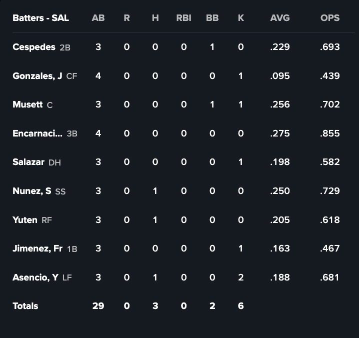 One of these teams was bound to be shut out Tuesday; as it turns out, it was Salem against the Riverdogs (Rays A), who held the 1 through 5 batters in Salem’s lineup to an 0-for-17 night. Salem’s lineup in its entirety managed just five baserunners, and while two steals put men in scoring position twice, technically, no one was in any situation of actually scoring when the lineup hits like this.