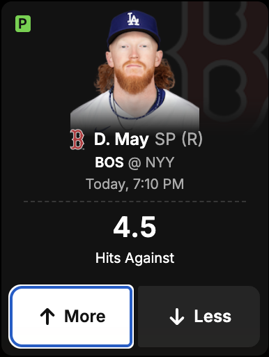 The Yankees enter with one of the more intimidating lineups in the MLB. They lead the league in total bases and home runs while ranking third in total runs tallied. May has given up more than 4.5 hits in all three starts with the Red Sox, six straight starts entering today and in 17 of the 22 games he has pitched this season overall. New York is not the type of lineup that will make these problems easier, and expect him to be vulnerable to giving up some hits tonight. This bar of expectation is too low based on his recent track record, and I expect May to allow more than 4.5 hits in his first taste of the rivalry matchup.
