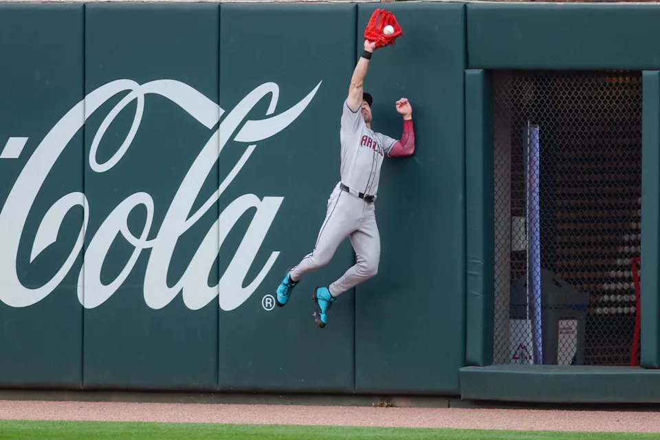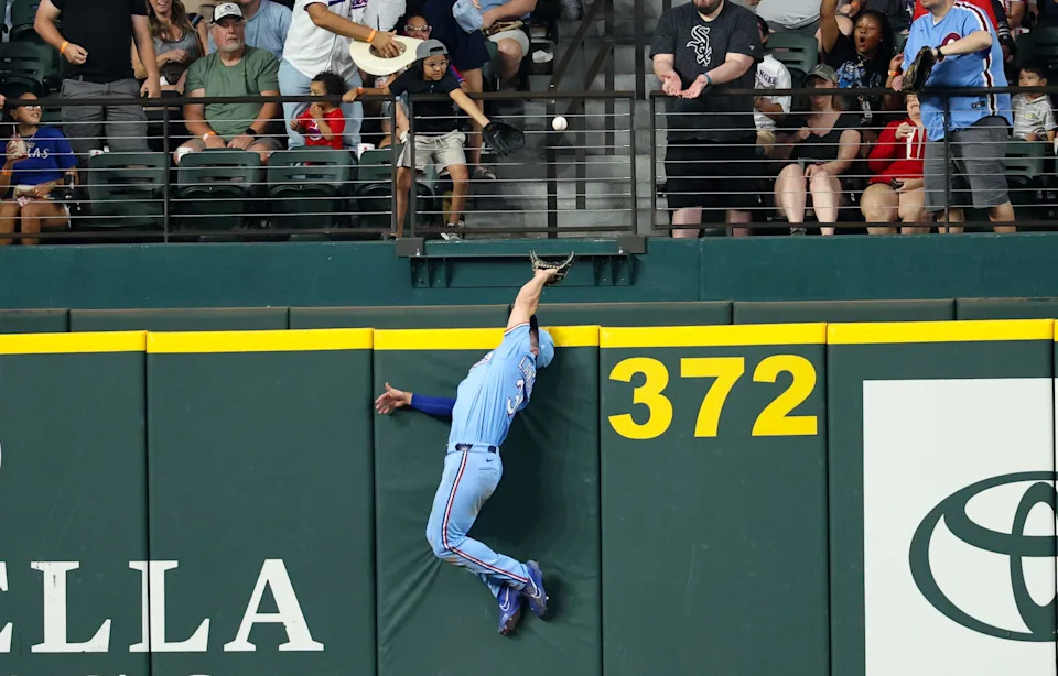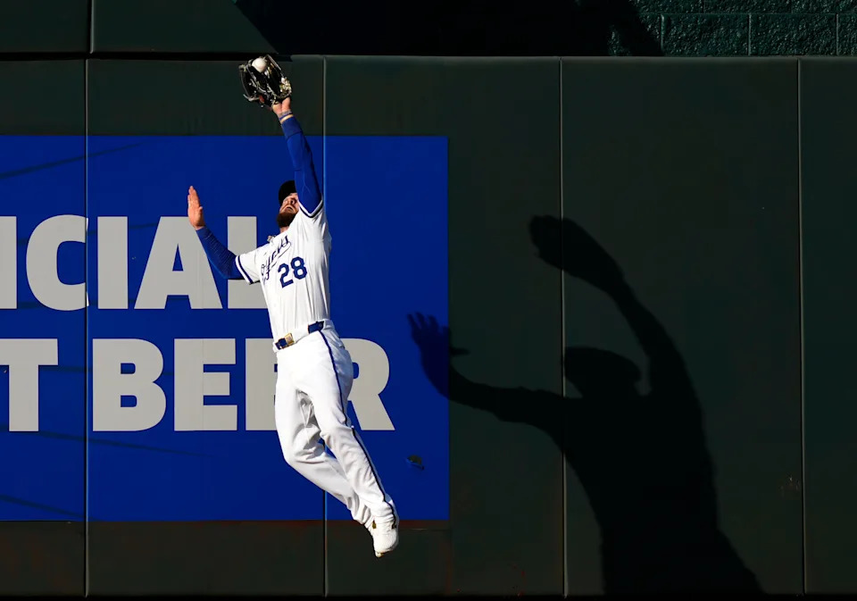 July 29: Kansas City Royals center fielder Kyle Isbel makes a leaping catch at the wall during the first inning against the Atlanta Braves at Kauffman Stadium.