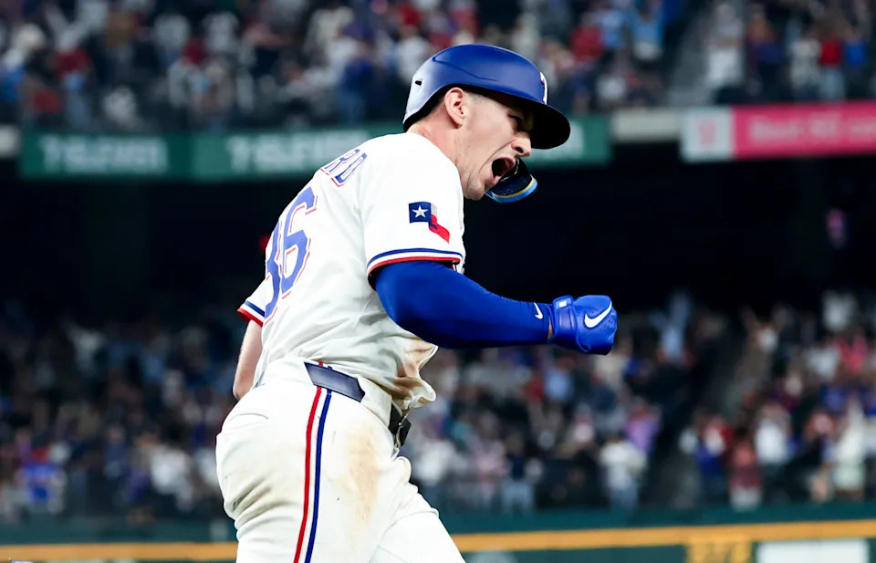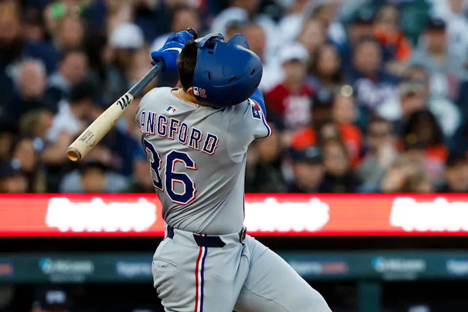 April 5: Texas Rangers left fielder Wyatt Langford (36) reacts after hitting a two-run home run during the seventh inning against the Tampa Bay Rays.
