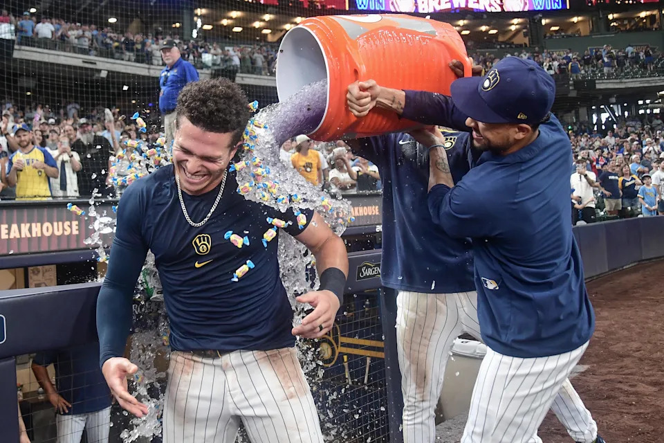 Aug. 10: The Milwaukee Brewers’ Isaac Collins gets a postgame dunk after hitting a walk-off home run against the New York Mets at American Family Field.