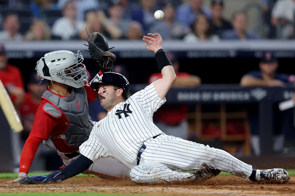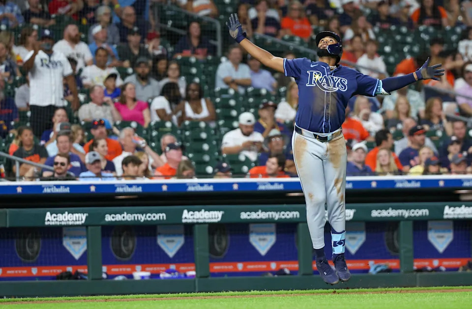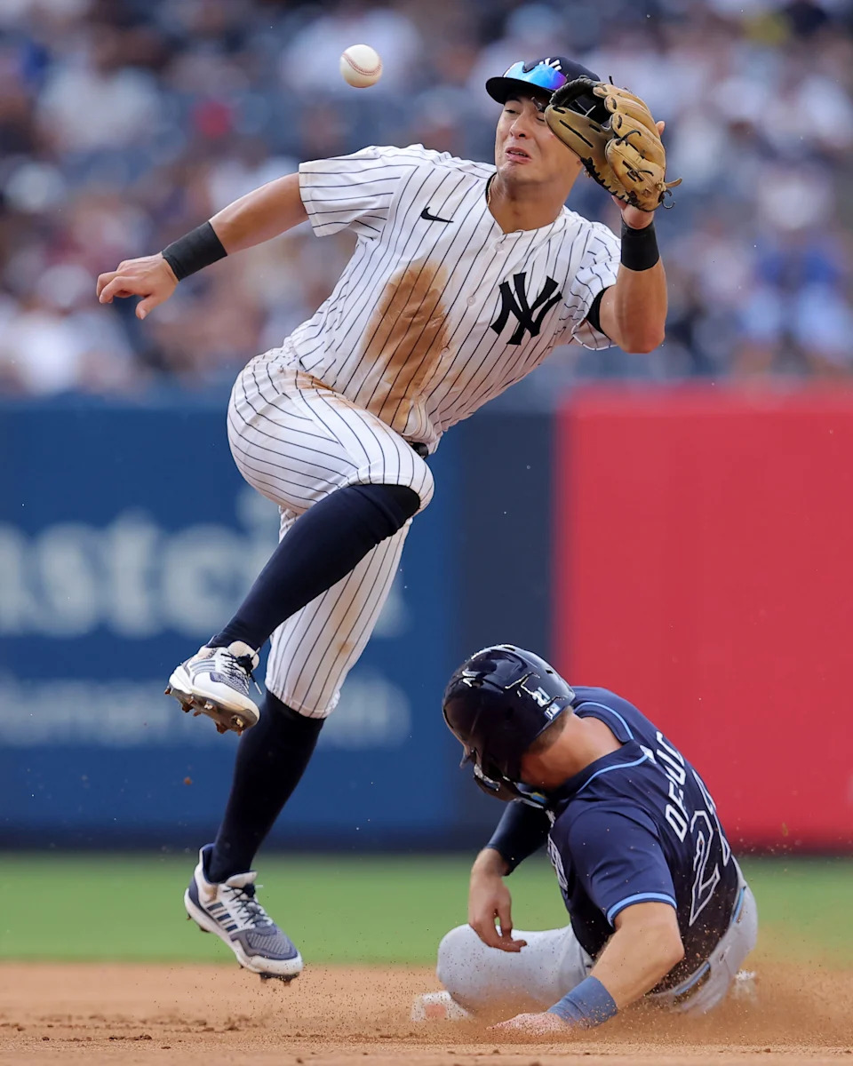 July 31: The Tampa Bay Rays’ Jonny DeLuca (21) steals second base ahead of a tag by New York Yankees shortstop Anthony Volpe during the fourth inning at Yankee Stadium. The Yankees won the game, 7-4.
