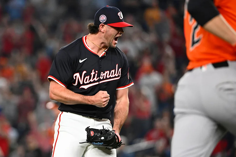 April 23: Washington Nationals pitcher Kyle Finnegan celebrates after the final out against the Baltimore Orioles.
