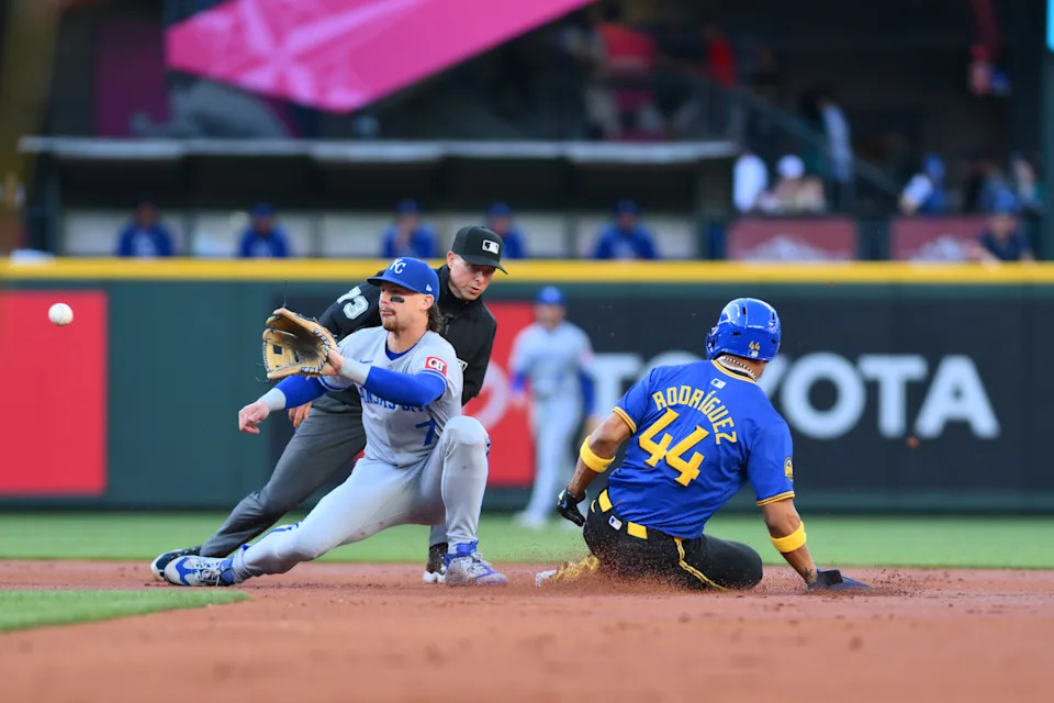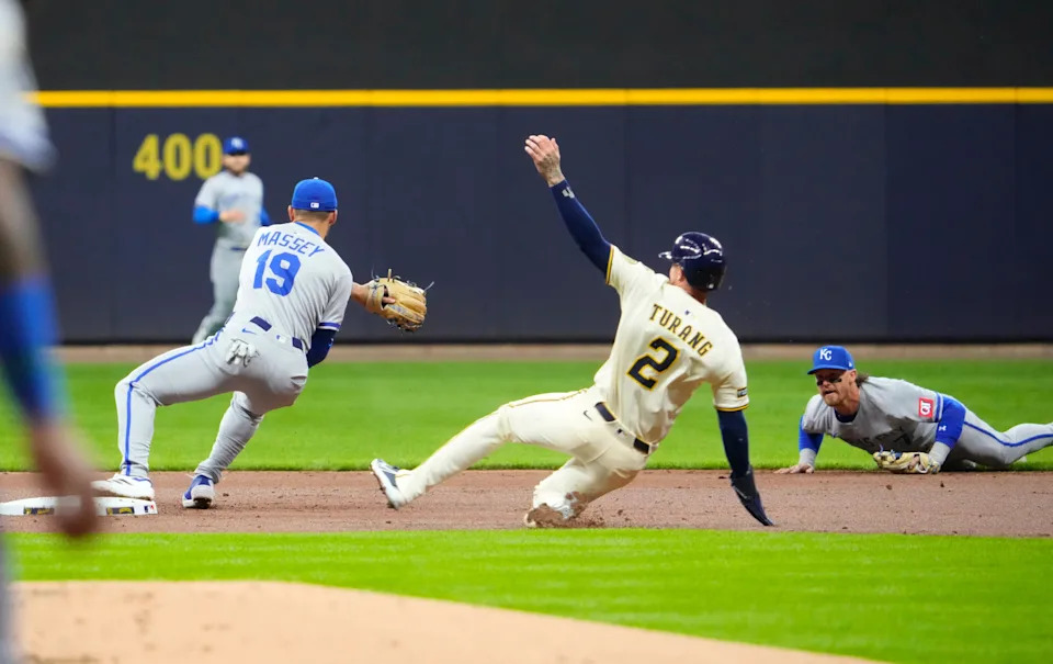 April 1: The Milwaukee Brewers’ Brice Turang (2) slides into second base as Kansas City Royals second baseman Michael Massey (19) gets the force out on a throw from Bobby Witt Jr. in the first inning at American Family Field. The Brewers won the game, 5-0.