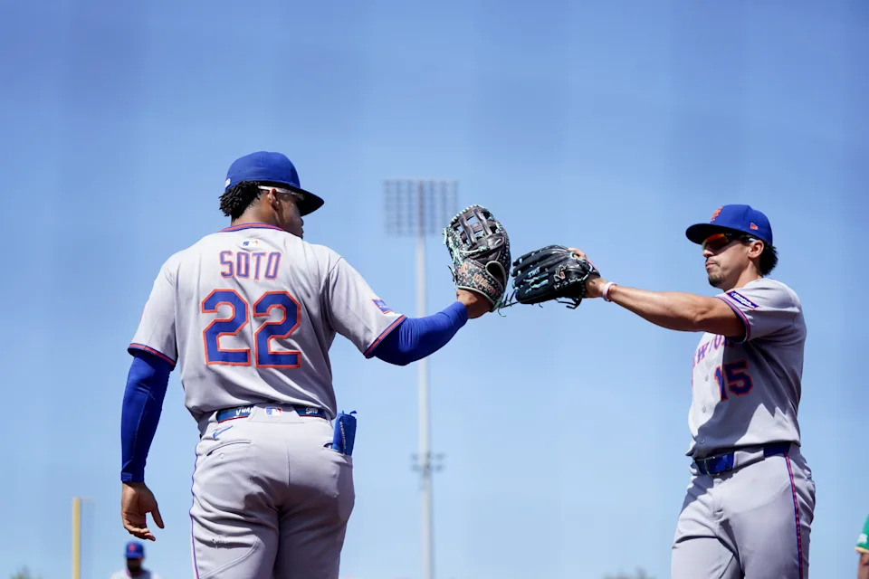 April 12: New York Mets right fielder Juan Soto (22) meets with outfielder Tyrone Taylor (15) before the start of the fifth inning against the Athletics.